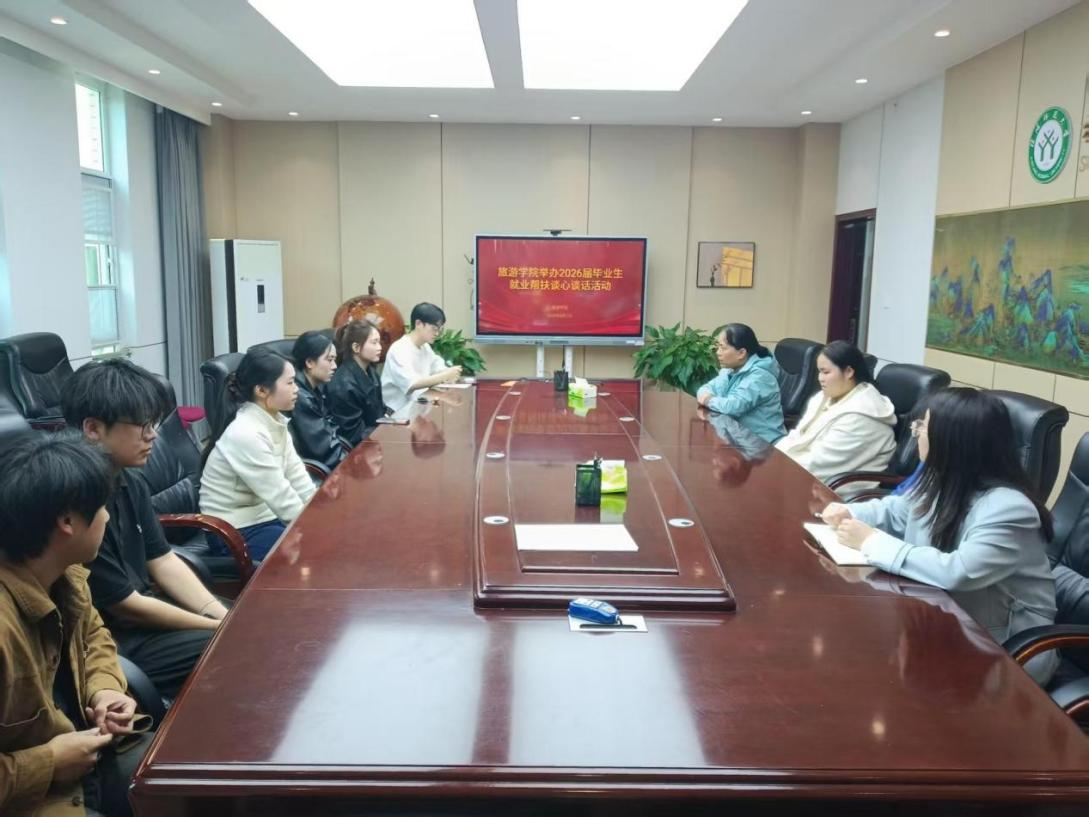 为切实筑牢毕业生就业服务保障,精准对接学生求职需求。4月1日下午,旅游学院在经管楼404会议室举办2026届毕业生就业帮扶谈心谈话活动。旅游学院党委副书记路璐、就业秘书黄倩与毕业生代表以谈心谈话的形式,为毕业生提供“一对一”就业帮扶。